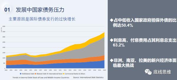 蓝色代表多边债务;橘红代表双边债务;灰色代表国际债券;黄色代表商业银行和其他债务真正份额增加比较多的是灰色部分,以及黄色的部分。灰色是国际债券,黄色是商业银行贷款,就像花旗、摩根士丹利。单从国际债券来讲,已经占中低收入国家担保外债比例一半以上,而且国际债券的主要持有方是欧美发达国家的投资机构,其特点是利息更高,如非洲国2013—2019 年发行的十年期欧洲债券息票率处于 4%—10%的区间;付息费用占其利息总支出的比例很大,2020年中低收入国家支付的国际债券利息达到 696 亿美元,占其利息总支出的 63.2%,作为比较,双边债务的利息仅占 9.8%【1】。