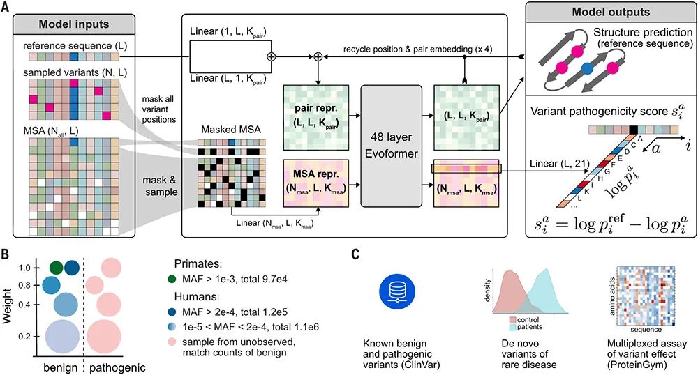 在第二阶段(上图A),模型针对人类蛋白质进行微调,并为MSA第二行中呈现的突变序列定义了额外的突变致病性分类目标。对于训练集,团队将良性标签分配给人类和灵长类动物群体中经常观察到的突变,并将致病标签分配给不存在的突变。此外,一旦模型在验证集上开始过度拟合,就立即停止训练模型。