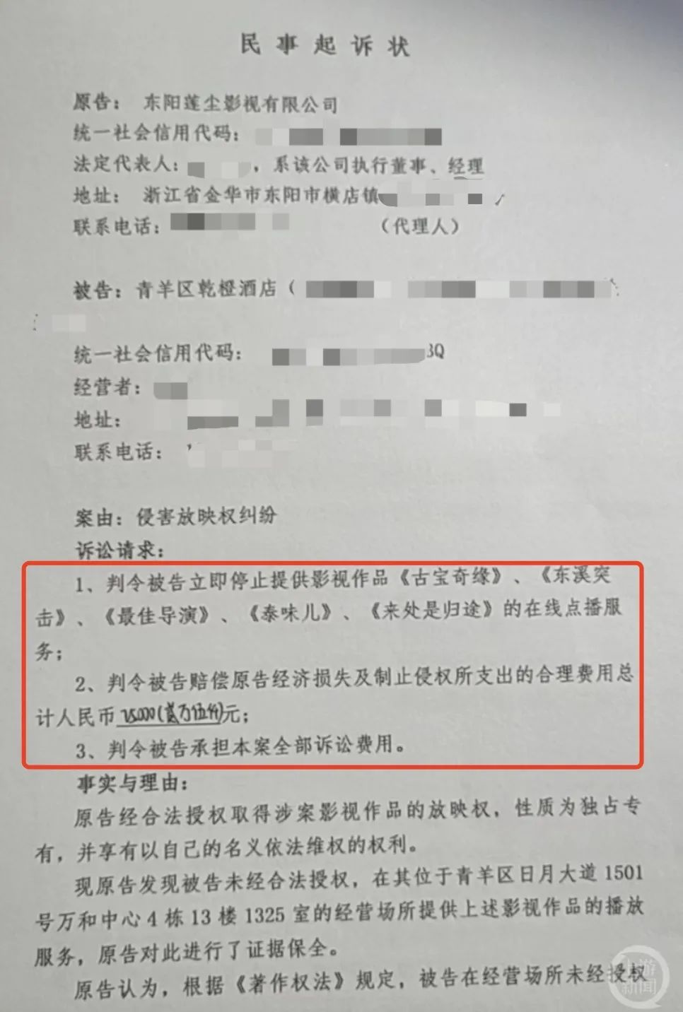 记者从民事起诉状上看到,原告为东阳莲尘影视有限公司,被告是青羊区乾橙酒店。东阳莲尘影视有限公司起诉称:“原告发现被告未经合法授权,在其经营场所提供有原告放映权影视作品的播放服务,侵害了原告对该影视作品享有的放映权,给原告造成了损失,且原告为了维权支付了相应的合理费用,被告依法应当承担侵权责任。现原告向贵院提起诉讼。”在“诉讼请求”一栏,上游新闻记者记者看到,东阳莲尘影视有限公司提出3项请求: