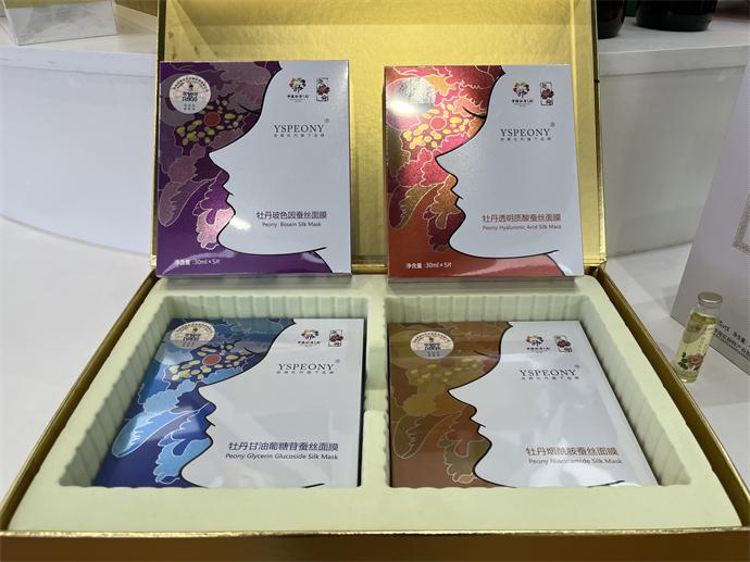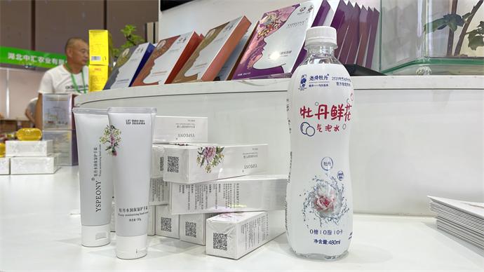 在菏泽尧舜牡丹生物科技有限公司牡丹产品展区,展台上摆放着牡丹面膜、牡丹牙膏、牡丹籽油、牡丹气泡水等产品,来挑选牡丹产品的人络绎不绝。