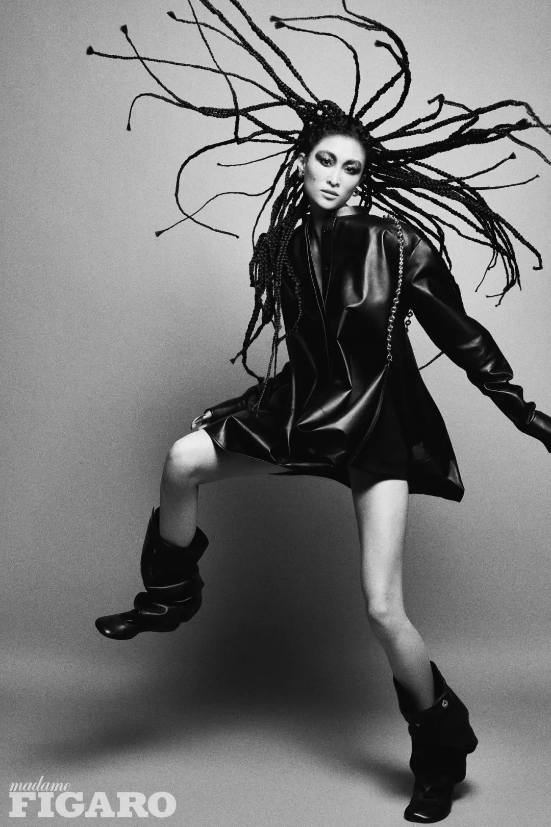 封面时装C黑色羊皮链条衬衫裙、黑色羊皮平底靴