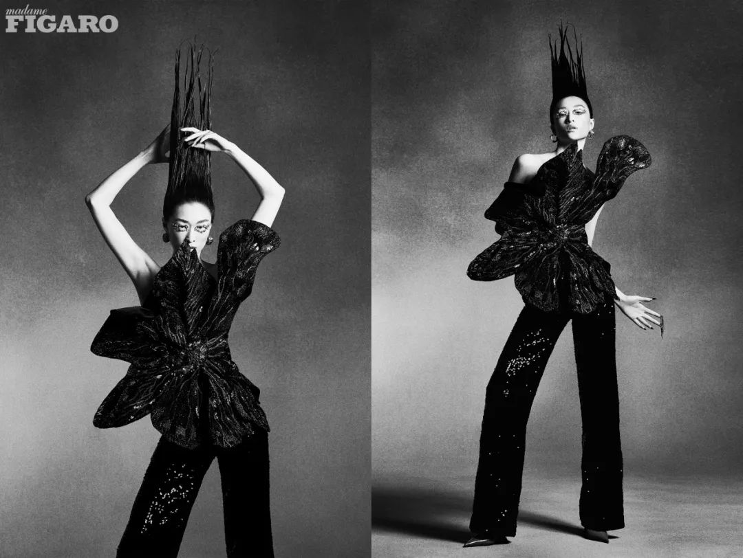 黑色花朵刺绣上衣、黑色亮片刺绣长裤均为 Rahul Mishra Haute Couture