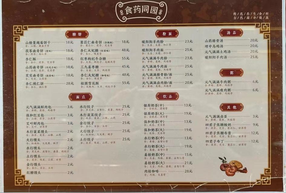 柳州市中医院药膳坊菜单。(图源/小红书@板蓝根炸鸡米花)据网上流传的早期菜单,每样奶茶都标明了功效,有健脾益肾奶茶、健脾化湿奶茶等。但如今的菜单上,或许是出于合规的考虑,删去了功效,改名为银荷奶茶、保和奶茶、水行奶茶等,保留了对中药食材成分的说明。