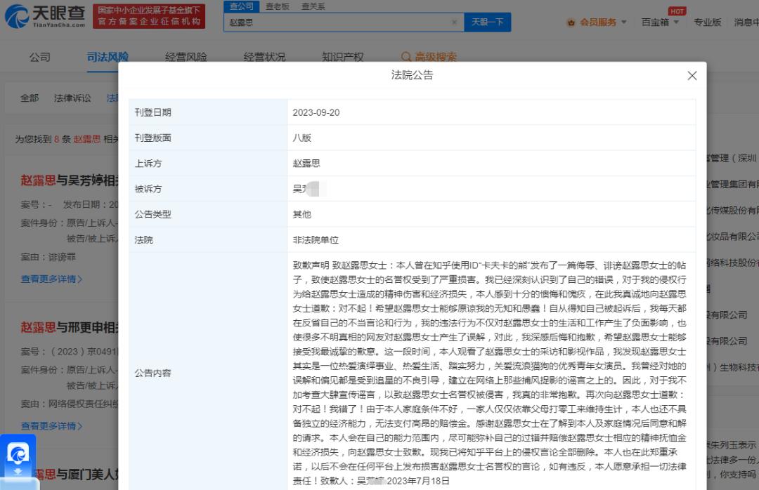 新闻多看点同日,天眼查APP,新增一则吴女士向演员赵露思致歉的公告。公告中称:其发布了一篇侮辱、诽谤赵露思女士的帖子,致使赵露思女士的名誉权受到严重损害。对此行为其认识到了自己的错误,对自己的侵权行为给赵露思造成的精神伤害和经济损失感到十分懊悔和愧疚,在此真诚地向赵露思女士道歉。