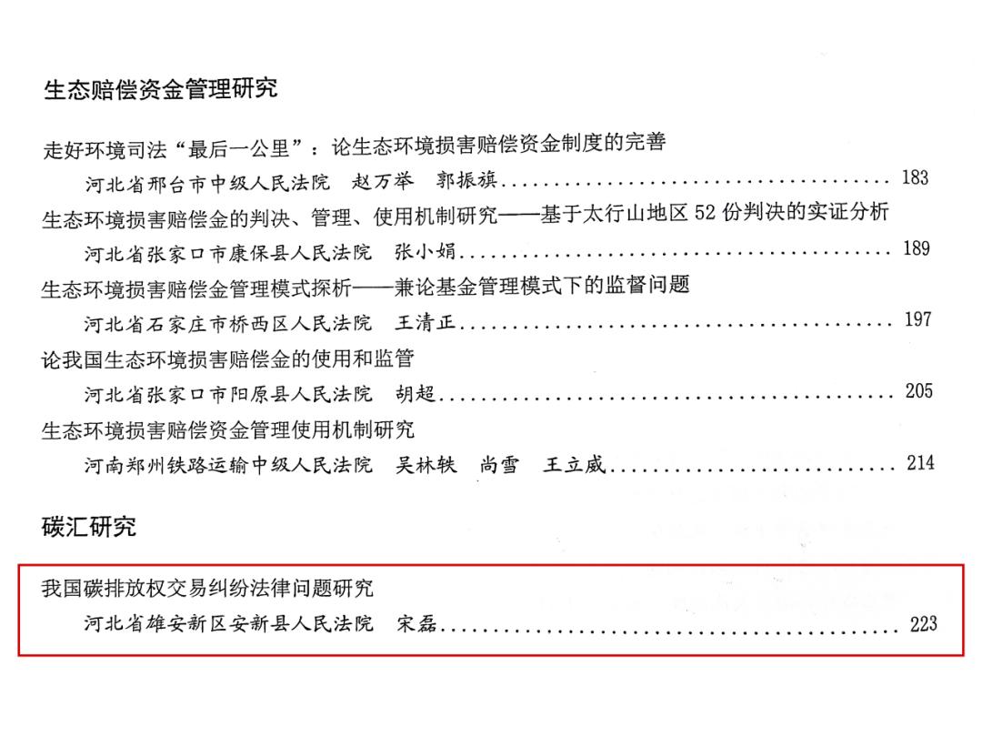 (上滑可见更多)我院白洋淀环境资源法庭干警宋磊撰写的《我国碳排放权交易纠纷法律问题研究》入选“环太行山四省(市)生态环境保护司法协作研讨会优秀论文集”。