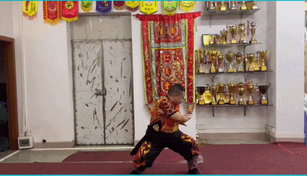 右足踏地,左膝提,小腿下垂,左拳胸,右拳头顶。
