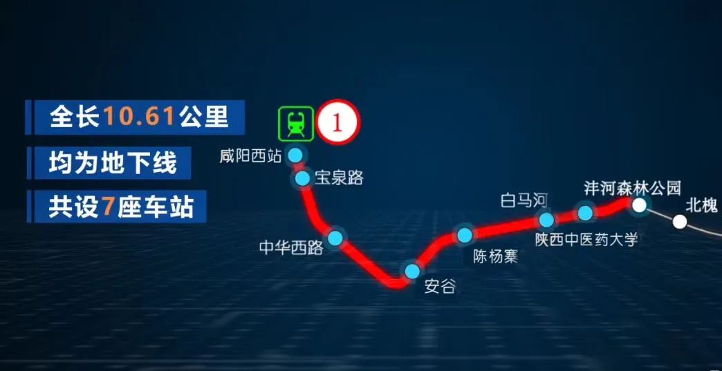 西安地铁1号线三期工程是西安城市轨道交通骨干线1号线的延伸,起于1号线二期沣河森林公园站,终至咸阳西站,线路全长10.61公里,均为地下线,设7座车站。1号线三期开通后,是陕西省首条跨市运营地铁线路,全线将连接西安、咸阳主城区,成为西北地区首条连通两市主城区的地铁线路,不仅能够让西安、咸阳两地市民实现快捷跨市出行,也将成为加快西安—咸阳一体化发展进程的轨道交通经济线、示范线。