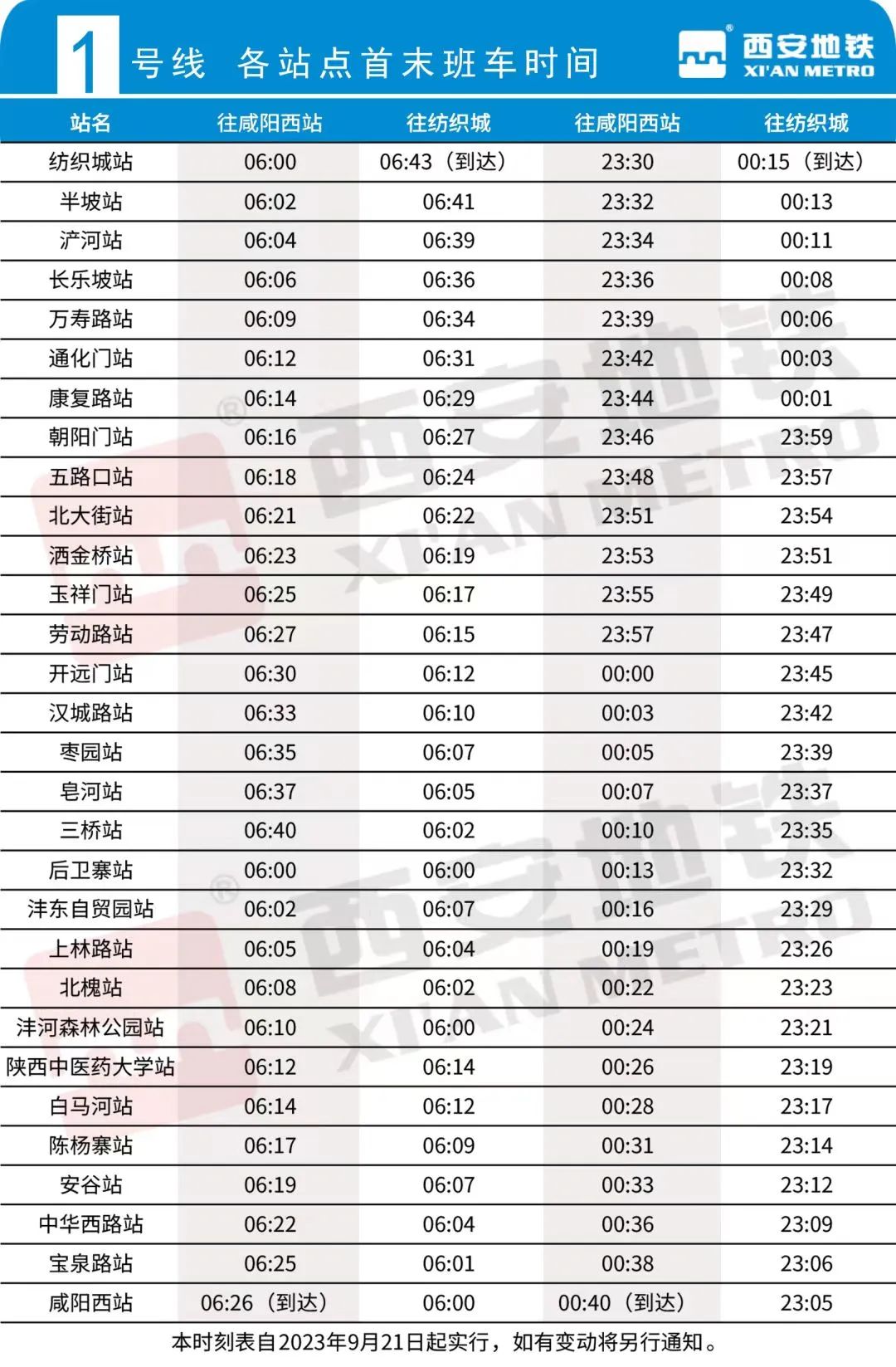 1号线三期开通后与既有1号线贯通运营,全线首班车采用多点发车方式,其中纺织城方向首班车分别由咸阳西站、沣河森林公园、后卫寨三个车站发出,发车时间均为06:00;往咸阳西站方向首班车分别由纺织城、后卫寨两个车站发出,发车时间均为06:00。纺织城站开往咸阳西站方向末班车发车时间为23:30,咸阳西站开往纺织城站方向末班车发车时间为23:05。其中,北大街与咸阳西站间运行只需要50分钟。