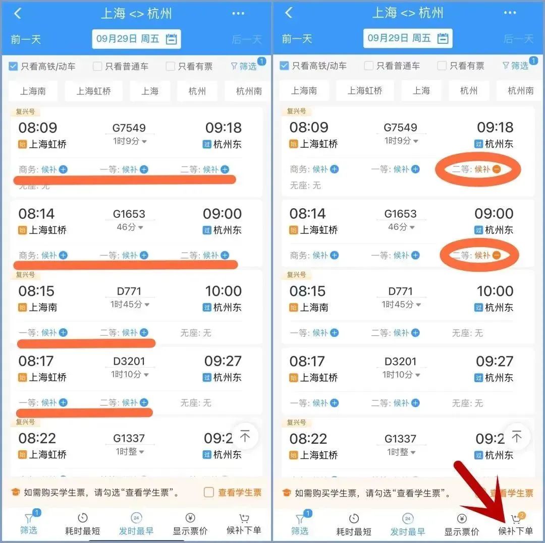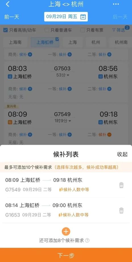 例如:小明候补了上海到杭州的5个车次,其中包含了一等座和二等座,预付款只付一张一等座的价格。如果系统候补到了二等座车票,将会退还一等座与二等座之间的差价。