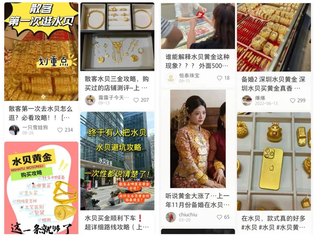 年轻人扎堆去水贝淘金。(图/小红书截图)小马有买金饰的爱好,8月旅游时去逛了水贝市场,周末人满为患。这里卖的都是真黄金,工艺未必比得上大牌,但工费却便宜不少。她告诉新周刊:“水贝工费还可以跟商家谈价,如果购买克重高,就找热门柜台聊工费,反之可以试试跟冷门柜台聊。”