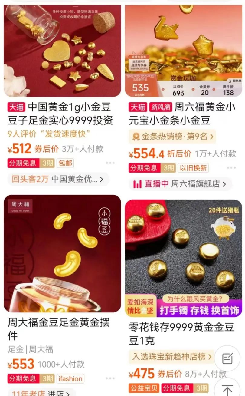 不同品牌的金豆豆价格。(图/购物平台截图)有网友表示,自己10年前买的几样金饰,总价9000多元,如今出于经济上的考虑,找了回收机构卖出,得到8980元。
