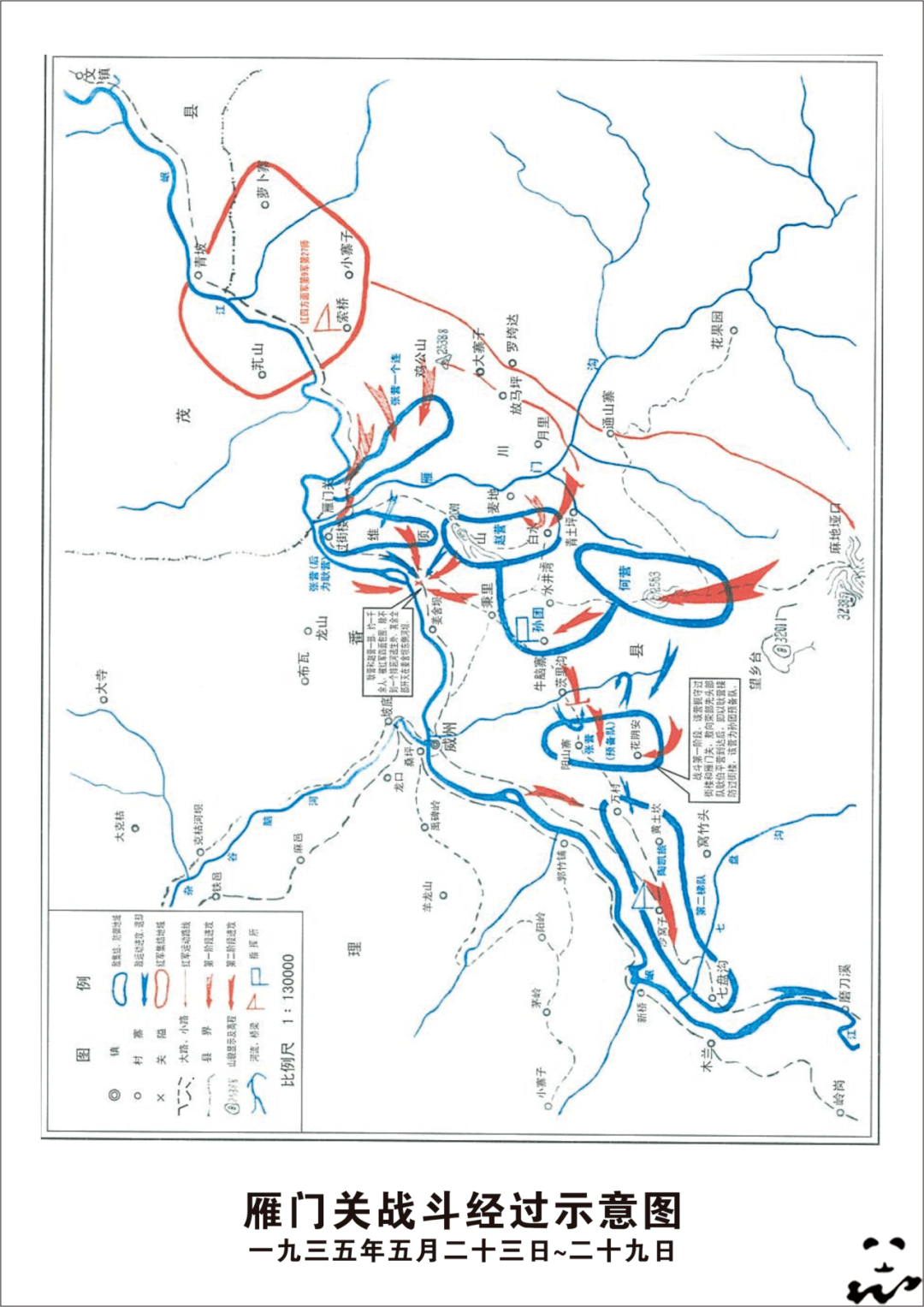 5月23日,红军攻打雁门关。其主力从索桥出发,经天台山向敌人发起进攻。经3个多小时激战,突破敌人的防御阵地,占领雁门关至鸡公山一线,敌人败退到雁门沟以南的维顶山。