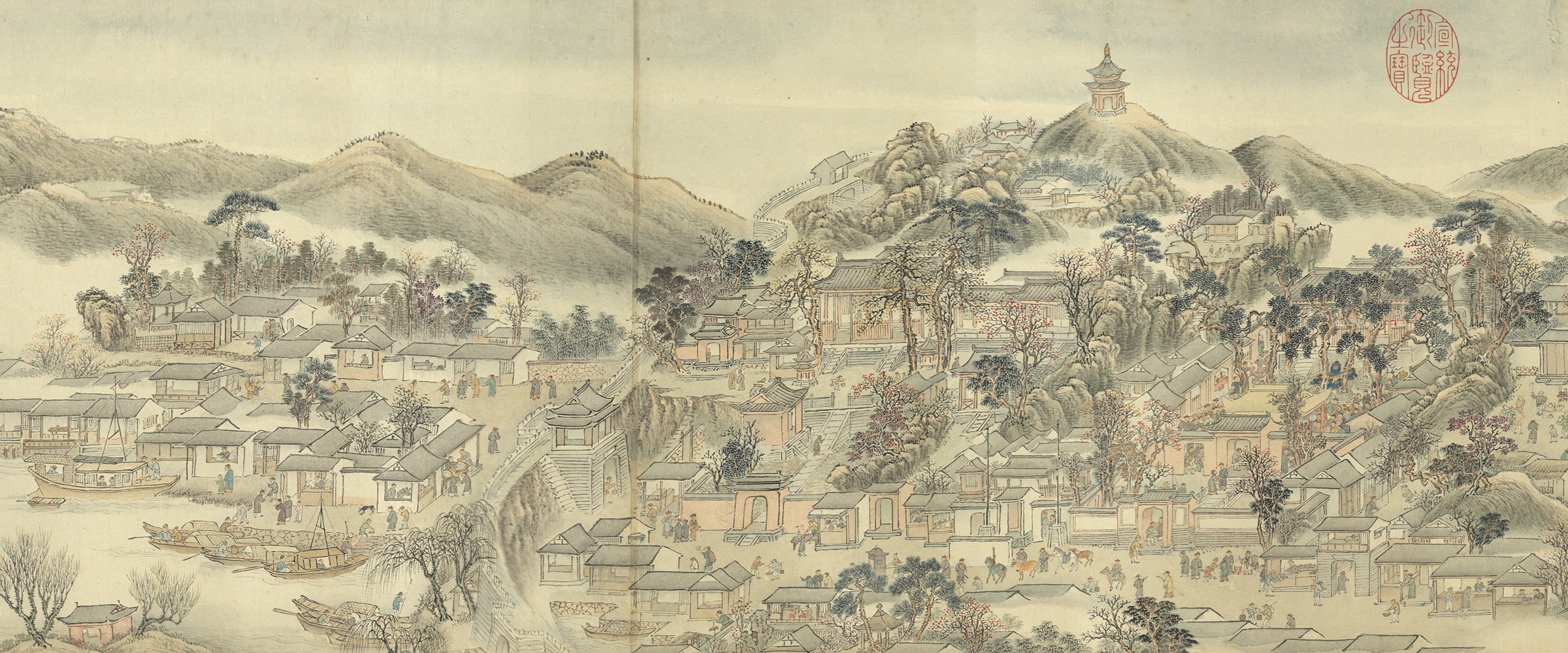 这幅由乾隆(1736-1795)年间宫廷画家周鲲创作的《升平万国图》,长480.5cm,高31.3cm,用写实的手法,描绘当时常熟的湖山胜迹、社会风情,被誉为“江南版《清明上河图》”。《升平万国图》现藏于台北故宫,描绘的是常熟风情,创作者周鲲是常熟人。