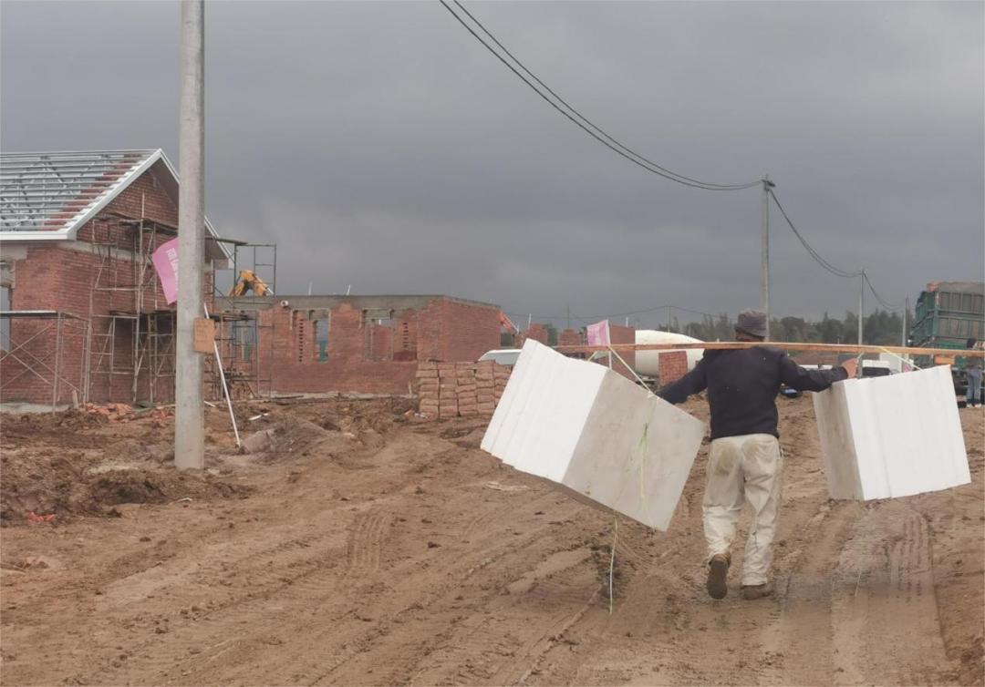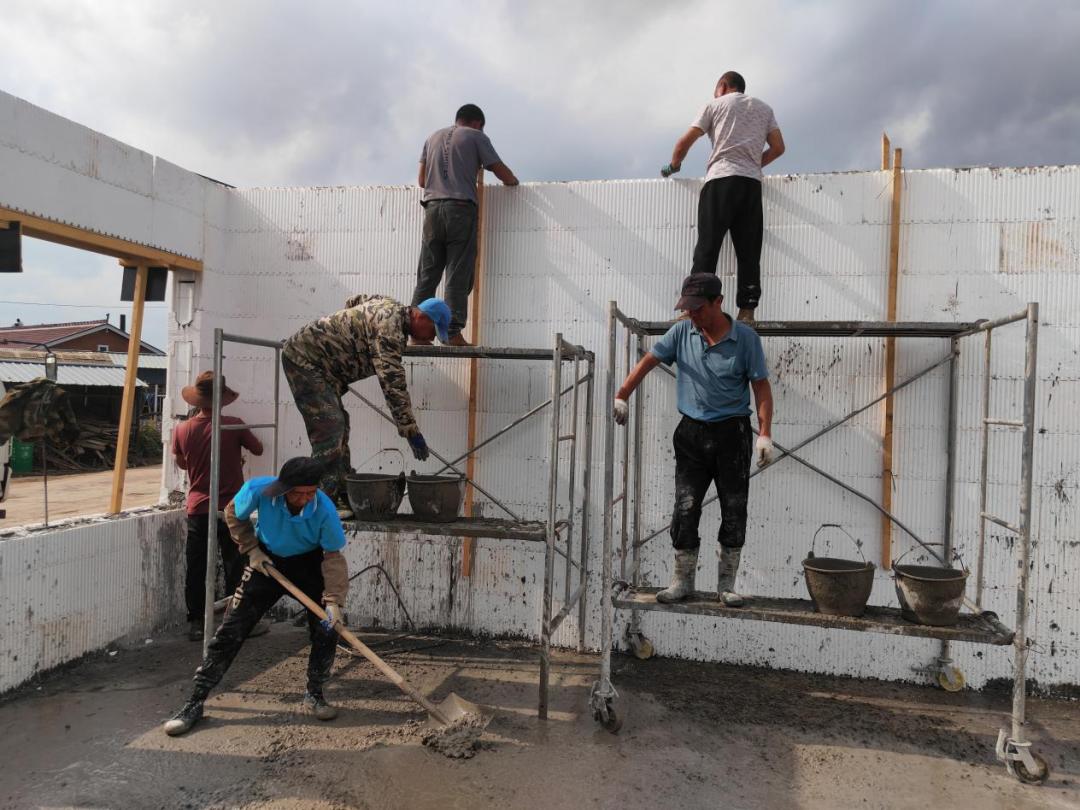 安置房建设用上新型环保材料,不仅能使建设周期缩短,还能隔热保温。郭贺/摄在长胜村村部所在的十里屯记者看到,村部办公室和卫生所已被洪水冲毁,工人们正在清理废墟,新村部预计11月份在原址重建完毕。不远处,村民陈宝家128平方米的重建砖房主体已经建完,工人们正在给外墙抹灰。