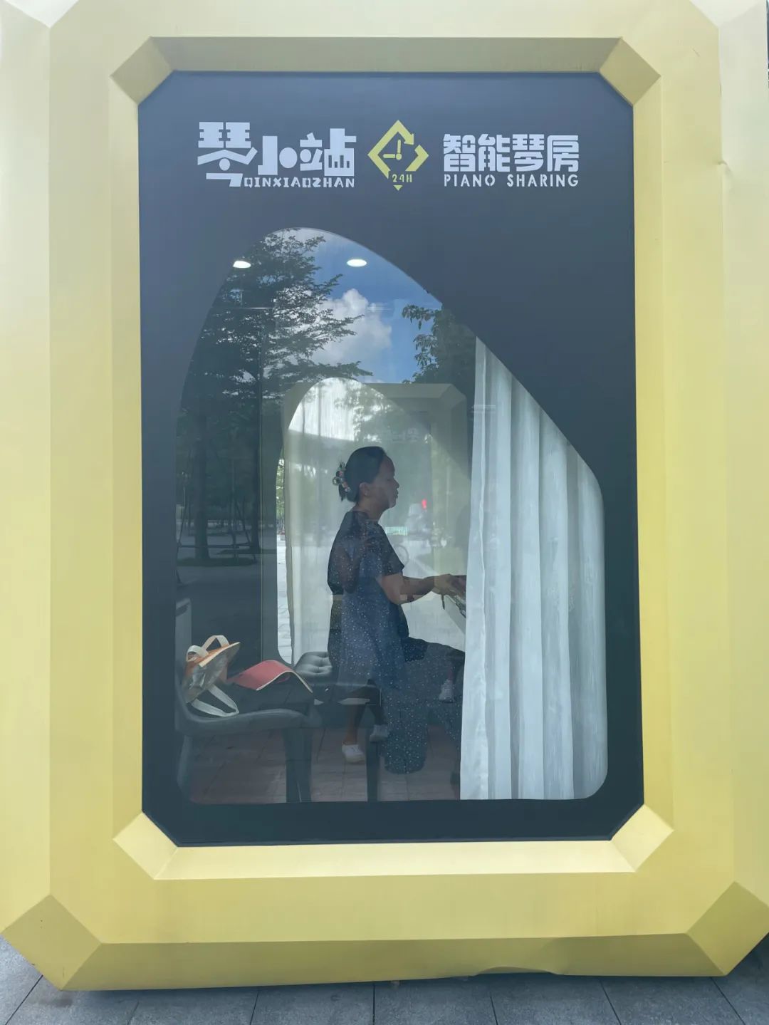 A woman plays the piano inside a shared piano booth in Futian District. Photo from Dute NewsShenzhen Daily invited Ecuadorian musician Angelo Castagneto to try one of the piano booths Tuesday morning. As he stood before the booth, he was so impressed that he couldn’t resist recording a short video to introduce the concept to his Instagram followers.