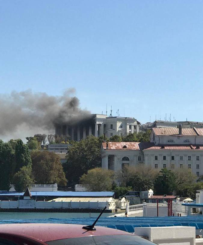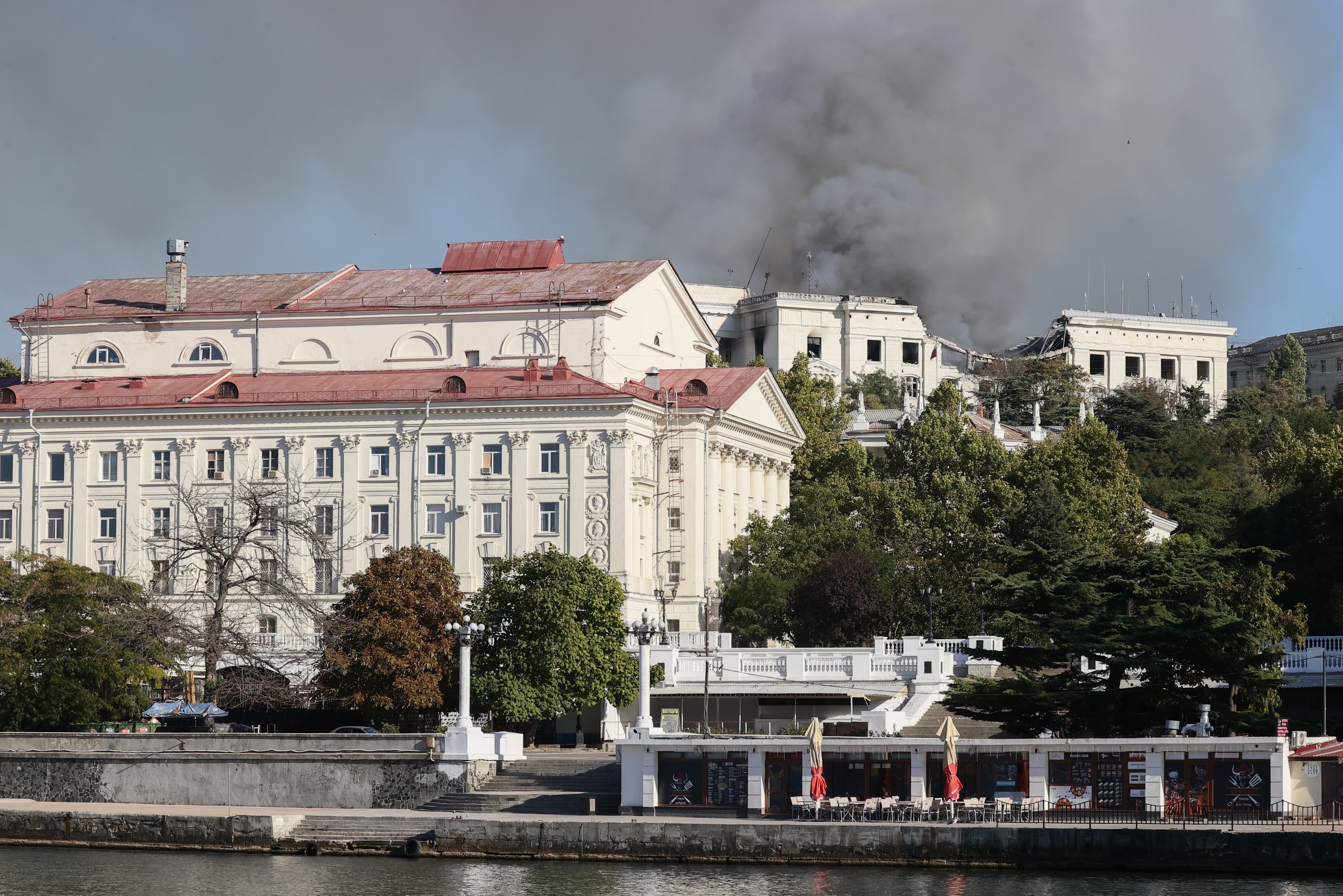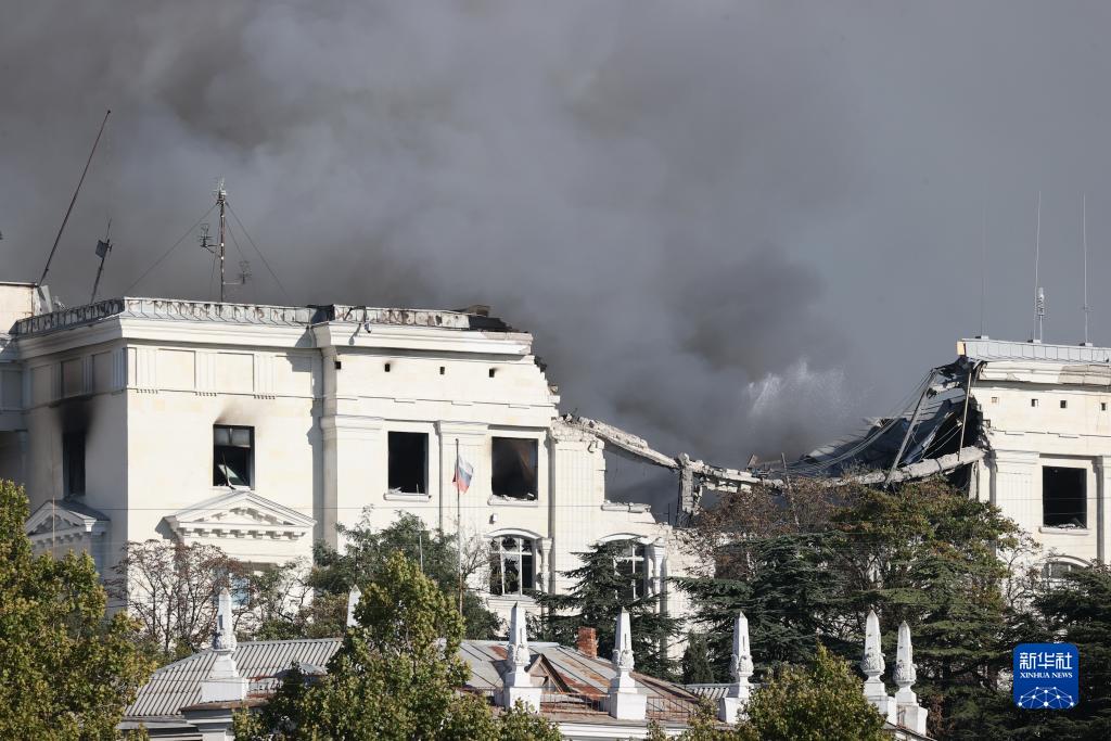当地时间2023年9月22日,俄罗斯黑海舰队总部遭袭后腾起浓烟。塞瓦斯托波尔市市长米哈伊尔·拉兹沃扎耶夫当天在社交媒体上说,乌军导弹碎片落在塞瓦斯托波尔一间剧院附近,不过黑海舰队总部周围的民用基础设施没有遭到破坏,街上居民也没有在袭击中受伤。空中机动大队已进入戒备状态。