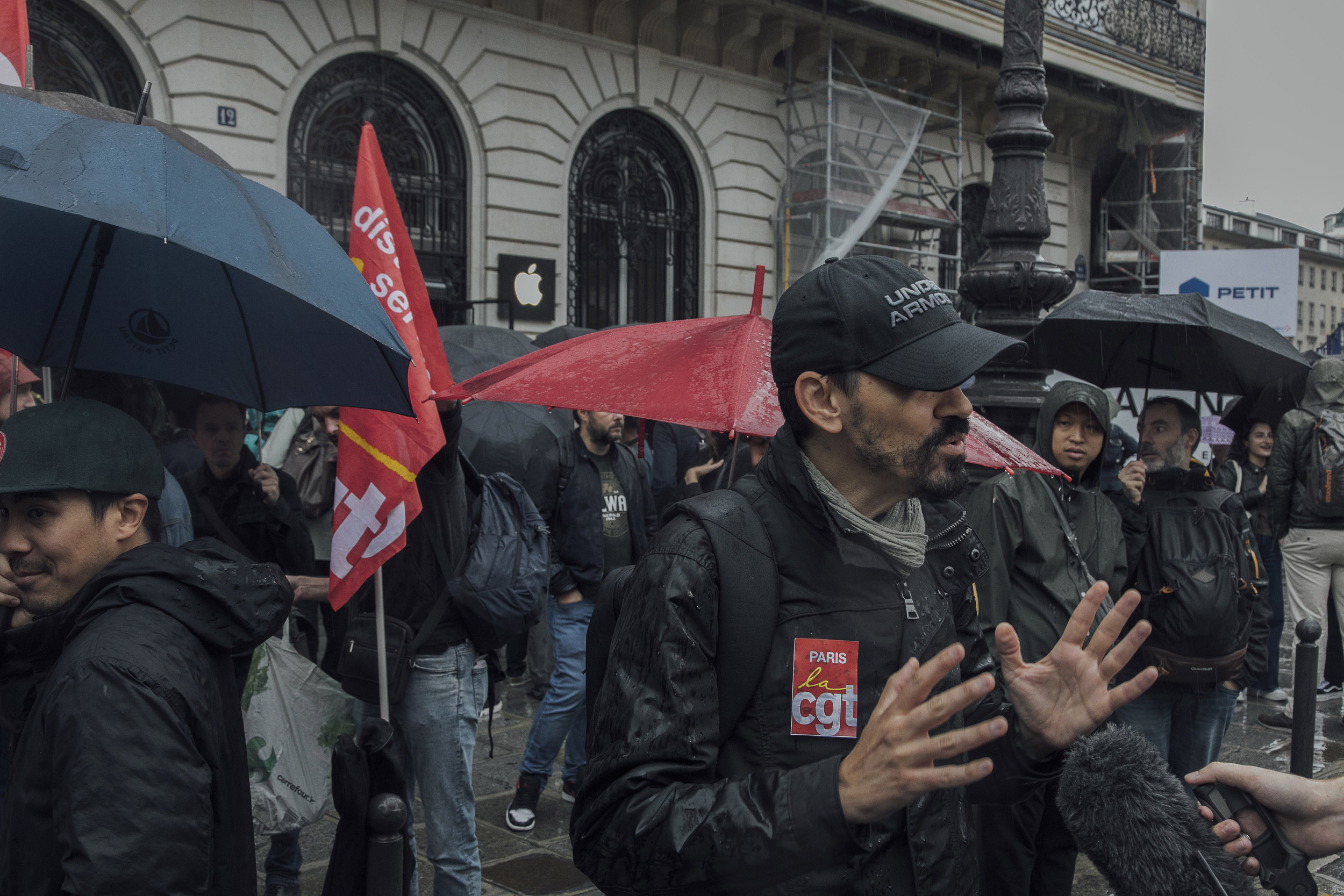 当地时间2023年9月22日,法国巴黎,在苹果专卖店门外举行的罢工抗议活动中,一名法国总工会(CGT)成员对记者讲话。当地时间9月22日,代表法国苹果专卖店员工的工会呼吁在9月22日和23日举行全国罢工,恰逢新款iPhone 15上市。多国卡车司机持续在德国举行绝食讨薪