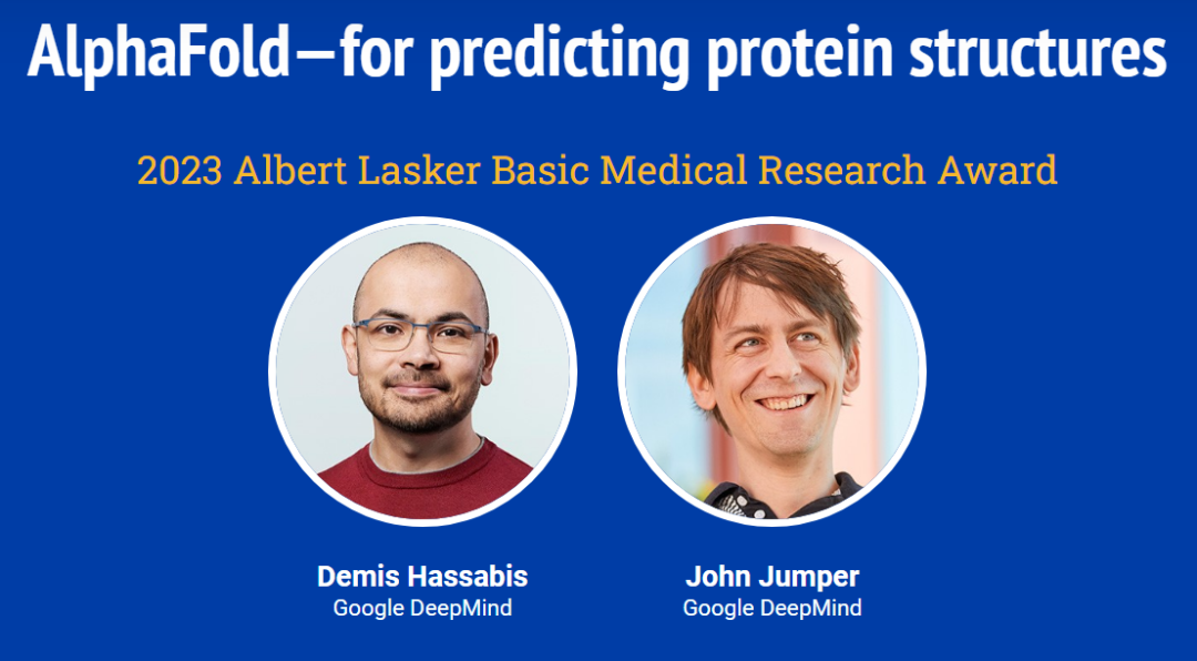 2023年的拉斯克基础医学研究奖授予了谷歌DeepMind公司的Demis Hassabis博士,和John Jumper博士,表彰他们发明了能够预测蛋白质三维结构的革命性技术——AlphaFold。