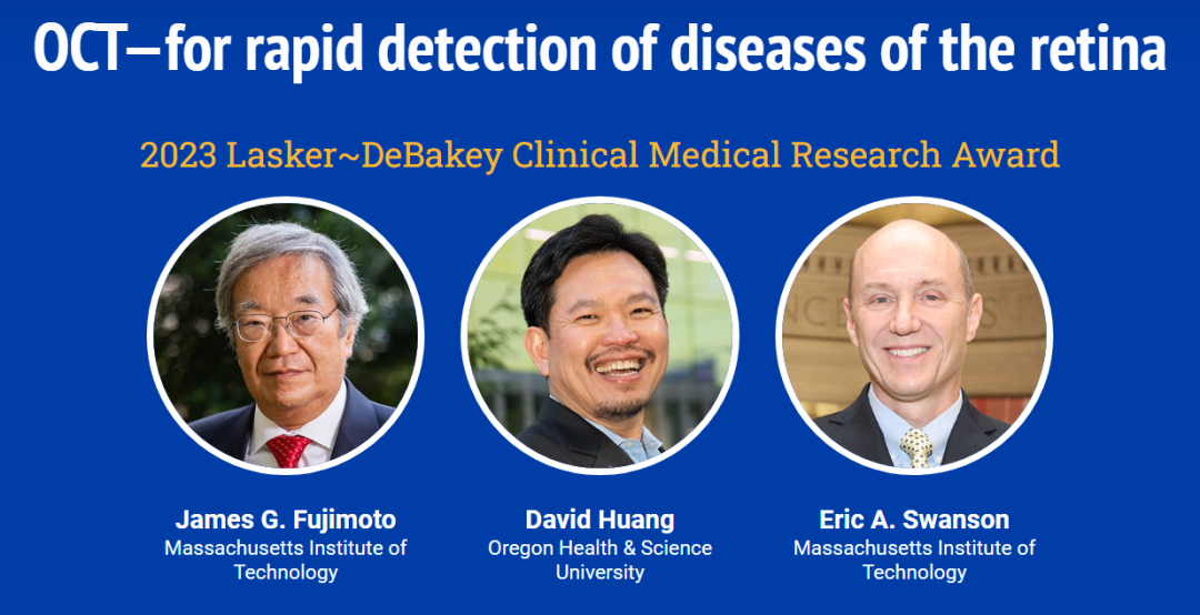 2023年的拉斯克临床医学研究奖授予了发明OCT技术的三位科学家。James G. Fujimoto教授、Eric A. Swanson先生以及David Huang教授在上个世纪90年代通过将光学、电信工程和医学结合在一起开发出了OCT技术。该技术通过利用光束来观察视网膜等人体组织内的微观结构,能够实时无痛地生成眼睛内部结构的高分辨率横截面图像,而无需身体接触。
