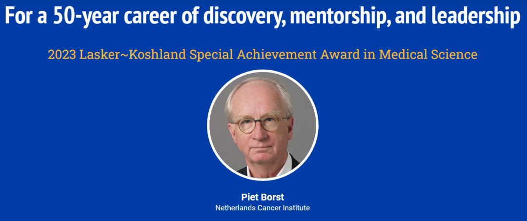 医学科学特殊成就奖的获得者是荷兰癌症研究所的Piet Borst博士,以表彰他50年来在科学发现、指导和领导方面的杰出成就。