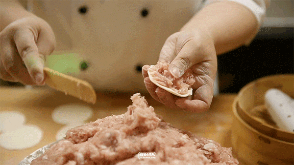 剁碎的猪皮需要熬煮3-4小时才能变成猪皮冻。而馅心用的是优选的三种部位的猪肉,按照比例进行调配。除了肉和少许盐,没有其他调味,吃进嘴里满满猪肉的香气。(小时候会猜测,小笼里的汤汁,是不是用针管打进去的)/ 小分队大数据-小笼馒头篇 /