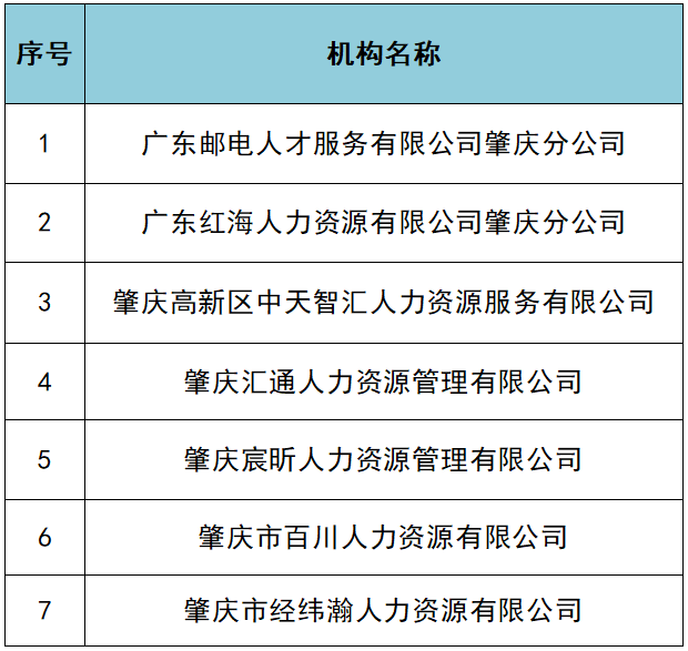 为深入贯彻党中央、国务院关于加快推进市场监管体系和社会信用体系建设有关精神,进一步加强肇庆市人力资源服务行业诚信体系建设,推动人力资源服务机构诚信自律,提升行业诚信服务水平,营造争当诚信示范的发展环境,根据《关于开展2023年肇庆市人力资源诚信服务示范机构评选活动的通知》精神,经宣传发动、材料审核、专家评审等程序,并经公示无异议,确定广东邮电人才服务有限公司肇庆分公司、广东红海人力资源有限公司肇庆分公司等7家人力资源服务机构为“肇庆市人力资源诚信服务示范机构”,具体名单见附件。