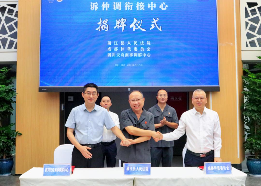 为进一步完善矛盾纠纷多元化解机制,助力优化法治营商环境,9月22日,成都仲裁委员会正式入驻蒲江县法务中心,与蒲江法院、天府商事调解中心共同构建“法院+仲裁+调解”对接机制,并在蒲江县法务中心挂牌成立“诉仲调衔接中心”,积极为市场主体提供专业、高效、多元的纠纷化解服务。