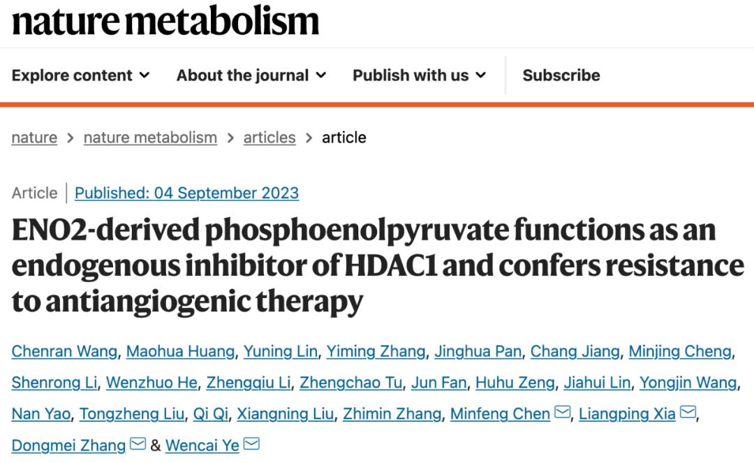 发表在 Nature Metabolism 期刊的论文题为:ENO2-derived phosphoenolpyruvate functions as an endogenous inhibitor of HDAC1 and confers resistance to antiangiogenic therapy