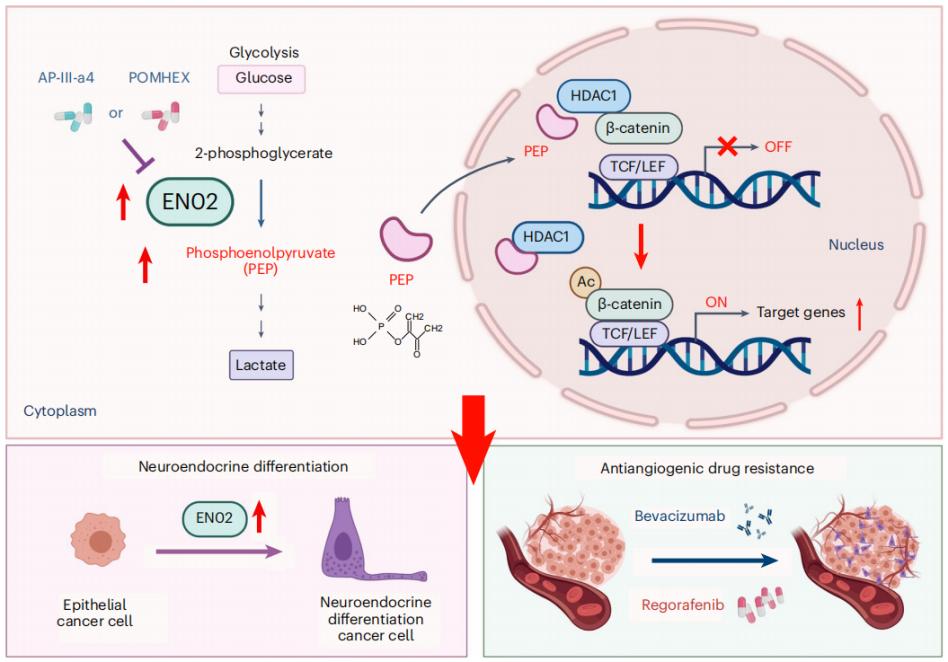 结直肠癌(CRC)肝转移是肿瘤致死的主要原因,血管靶向药物广泛应用于转移性CRC的临床治疗,但耐药频发,亟需探究其机制和解决方案。研究团队从代谢重编程的角度研究了血管靶向药物耐药的调控新机制,发现糖酵解酶烯醇化酶ENO2是驱动CRC对血管靶向药物耐药的关键因素,ENO2代谢产物磷酸烯醇丙酮酸(PEP)能选择性与HDAC1结合并抑制其活性,从而提高β-catenin乙酰化并激活β-catenin通路,进而促进CRC细胞恶性行为和耐药。联合使用ENO2抑制剂能有效克服血管靶向药物耐药。