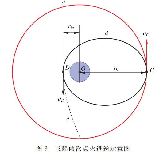 如图 3 所示,Oberth 方法是让飞船在圆轨道 c 上某点 C 时先向运动方向喷气减速使其降至离地球更近的椭圆轨道 d 上,接着在近地点 D 处再进行一次向运动反方向的喷气加速进入双曲轨道 e 从而完成逃逸过程。