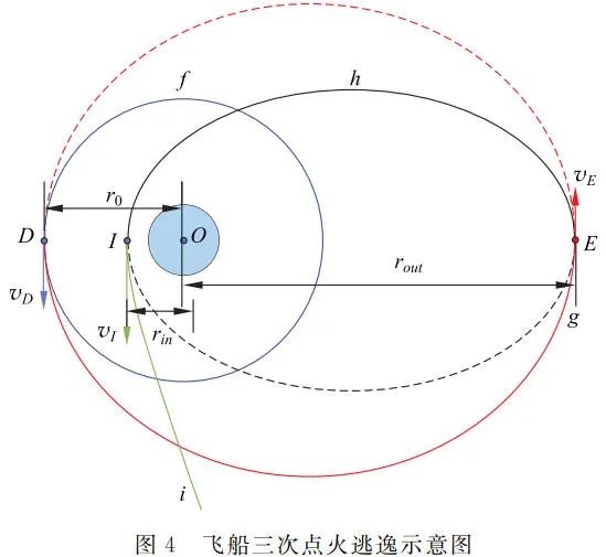 如图 4 所示,三次点火逃逸的方案为先让飞船喷气加速使其升至离地球更远的椭圆轨道上,接着在远地点再喷气减速降至离地球较近的椭圆轨道上,最后在运动至近地点时进行第三次加速逃逸。