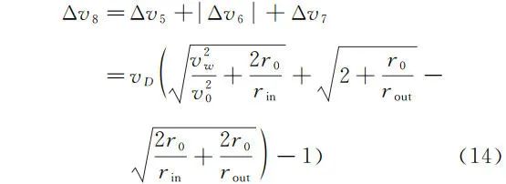 因此三次点火逃逸方式总的速度变化大小为:(由于速度变化的大小对应着燃料消耗的多少,因此减速导致的 Δv6 取绝对值)