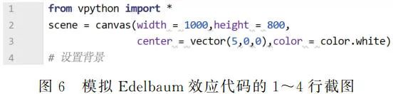 首先,录入如图 6 所示代码 1~3 行,导入 VPython 库并设置背景。