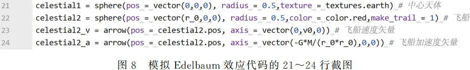 接着是模拟 Edelbaum 效应代码的参数设置部分,如图 7 所示,其中第 15 行由式(11)得到,第 16、19 行由式(6)得到,第 17 行由式(12)得到,第 20 行由式(13)得到。为了方便的同时又不影响检验理论的正确性,此处非关键参数如万有引力常量和天体质量等都设为 1。
