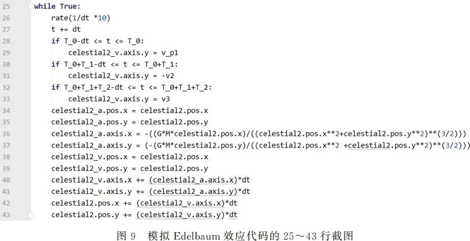最后,如图 9 所示 25~43 行代码通过 while 语句让其在运动过程中采用欧拉法进行对速度矢量和位置矢量的实时更新。运动中结合前面计算过的时间,通过三个 if 指令让飞船在到达相应的位置处进行点火变速,运行后最终可以观察到图 5 最右边的轨迹。该模拟结果的运动情况和前面理论分析一致,由此可验证理论的正确性。