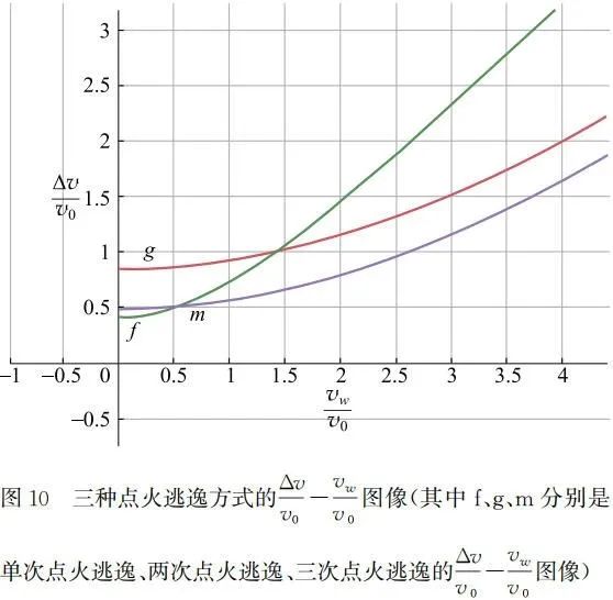 图像。由图像可以看出,当到达无穷远时的速度 vw 接近于 0 时,单次点火逃逸最省燃料,三次点火逃逸次之。而当到达无穷远时的速度 vw 较大时,三次点火逃逸最省燃料,而两次点火逃逸次之。