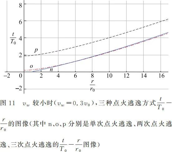 再令 vw = 5v0,得到当 vw 较大时的图像如图 12 所示。由图像可以看出,此时在 r 一定时,单次点火逃逸用时短,两次点火逃逸次之,三次点火逃逸用时最长。