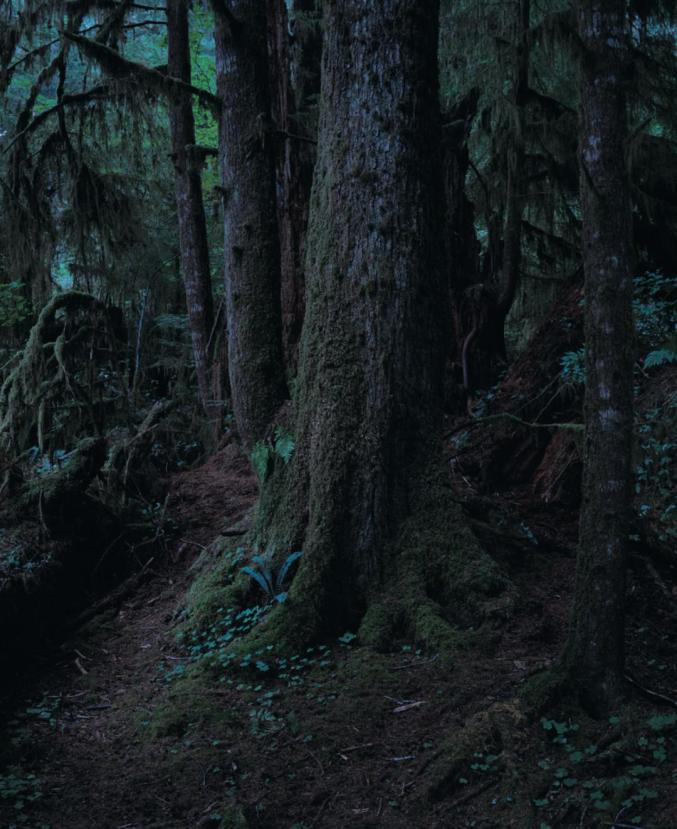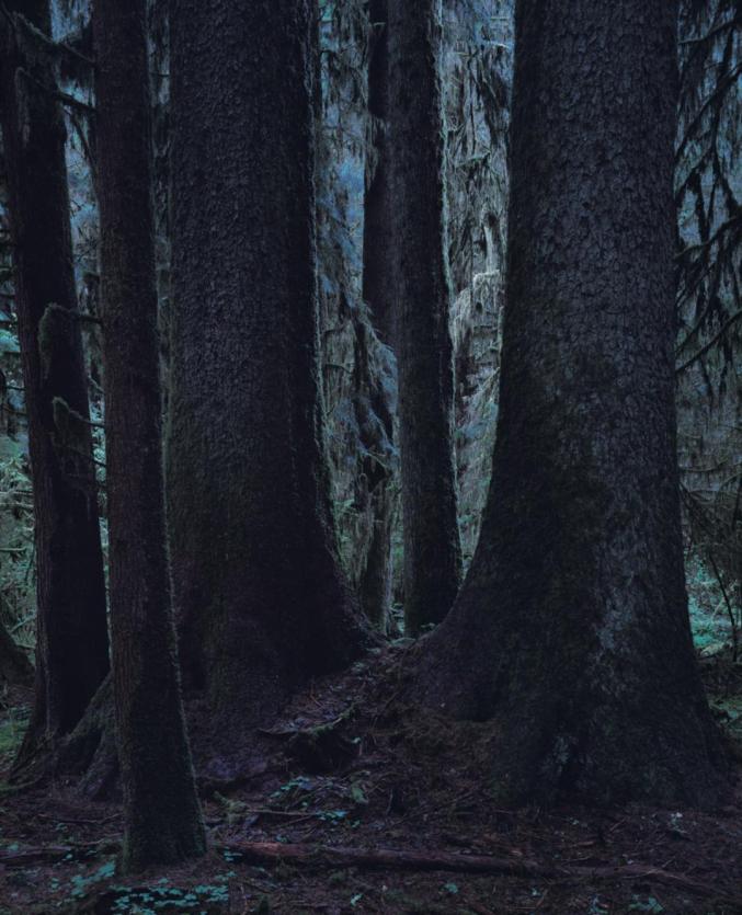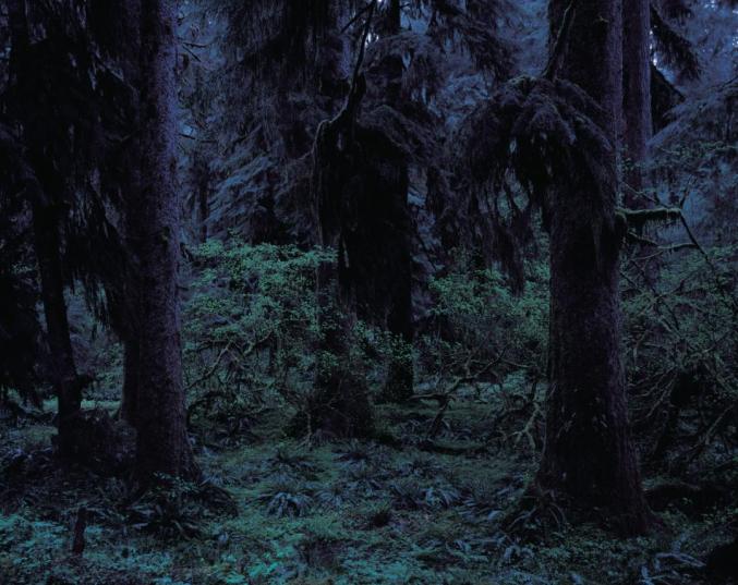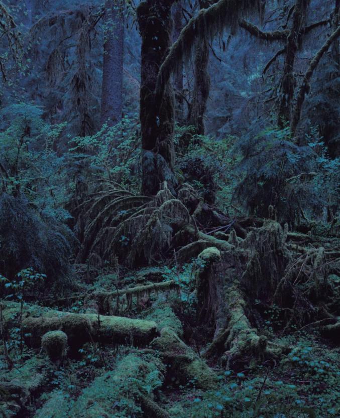 1990年代初,上田义彦在美国西海岸北部烟雨蒙蒙的奎诺特雨林地区拍摄了《Quinault》系列作品。在那个被雾霭和雨水封闭的世界里,生长着大量苔藓、野花和树的果实,栖息着世界上最大的云杉、杉树、冷杉、枫树等。在奎诺特,上田最初感到的是畏惧。他写道: