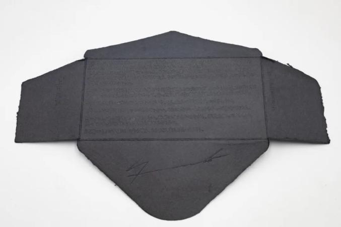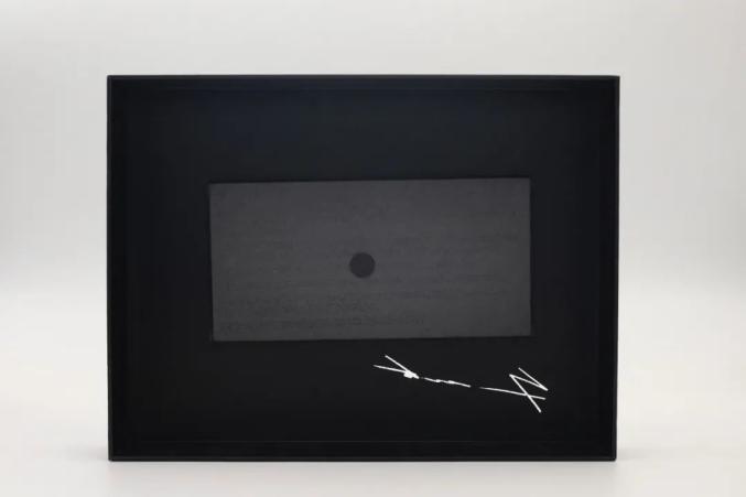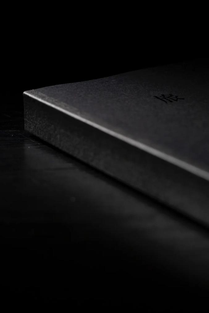 在盒盖背面,磁铁吸附着一个黑色手工棉纸信封,这也是首印版特有的附赠,信封上的压凹文字随着光线角度的改变产生微妙的明暗变换。