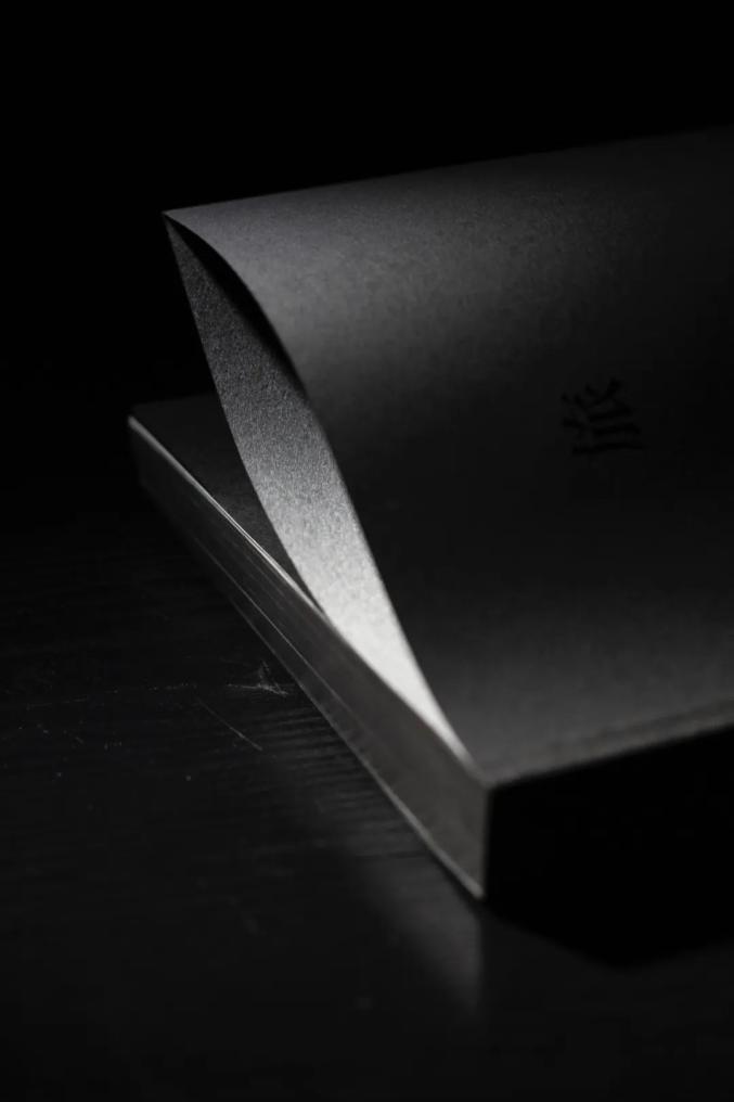 揭开护封,则看到印有金属黑色“旅”字的内封面,书脊处黑色漆布上渐暗的银色,黑色书口上浮现的丝网银色签名,合上书,封底筒子页里面黝黑处银色光影的悄然闪现。六种不同质感的黑色材质和多种印刷工艺结合,映照出十几种不同的“黑”。