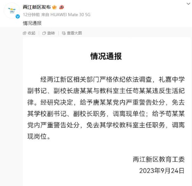 经两江新区相关部门严格依纪依法调查,礼嘉中学副书记、副校长唐某某与教科室主任苟某某违反生活纪律。经研究决定,给予唐某某党内严重警告处分,免去其学校副书记、副校长职务,调离现单位;给予苟某某党内严重警告处分,免去其学校教科室主任职务,调离现岗位。