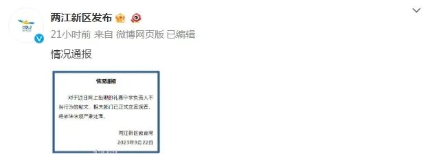 9月22日,重庆两江新区教育局发布通报称,对于近日网上出现的礼嘉中学负责人不当行为的帖文,相关部门已正式立案调查,将依法依规严肃处理。