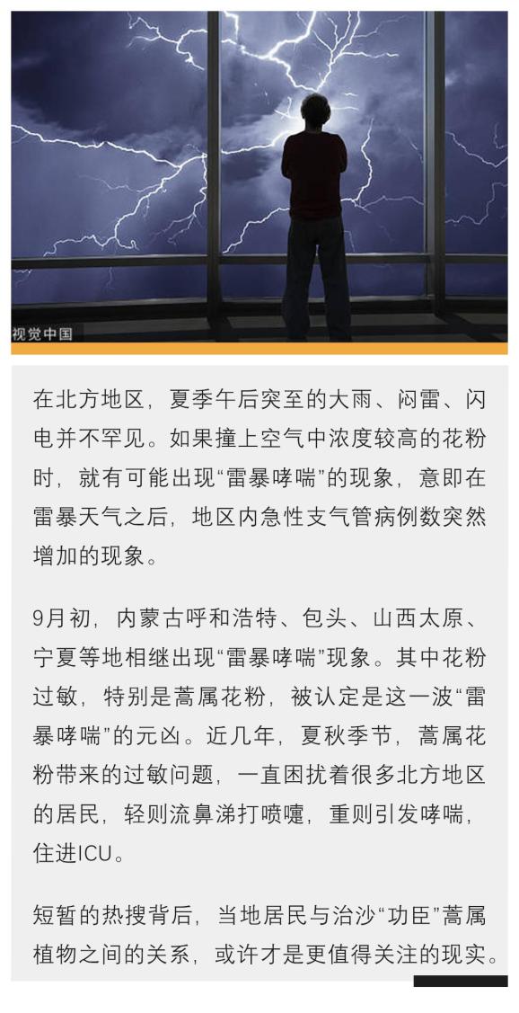 北京世纪坛医院变态反应科医生王文萍在文章中称,雷暴哮喘跟花粉过敏密切相关。一项研究证实,在中国西北地区,蒿属花粉是主要致敏源之一。季节性过敏性鼻炎人群中超过五成的人对蒿属花粉过敏。