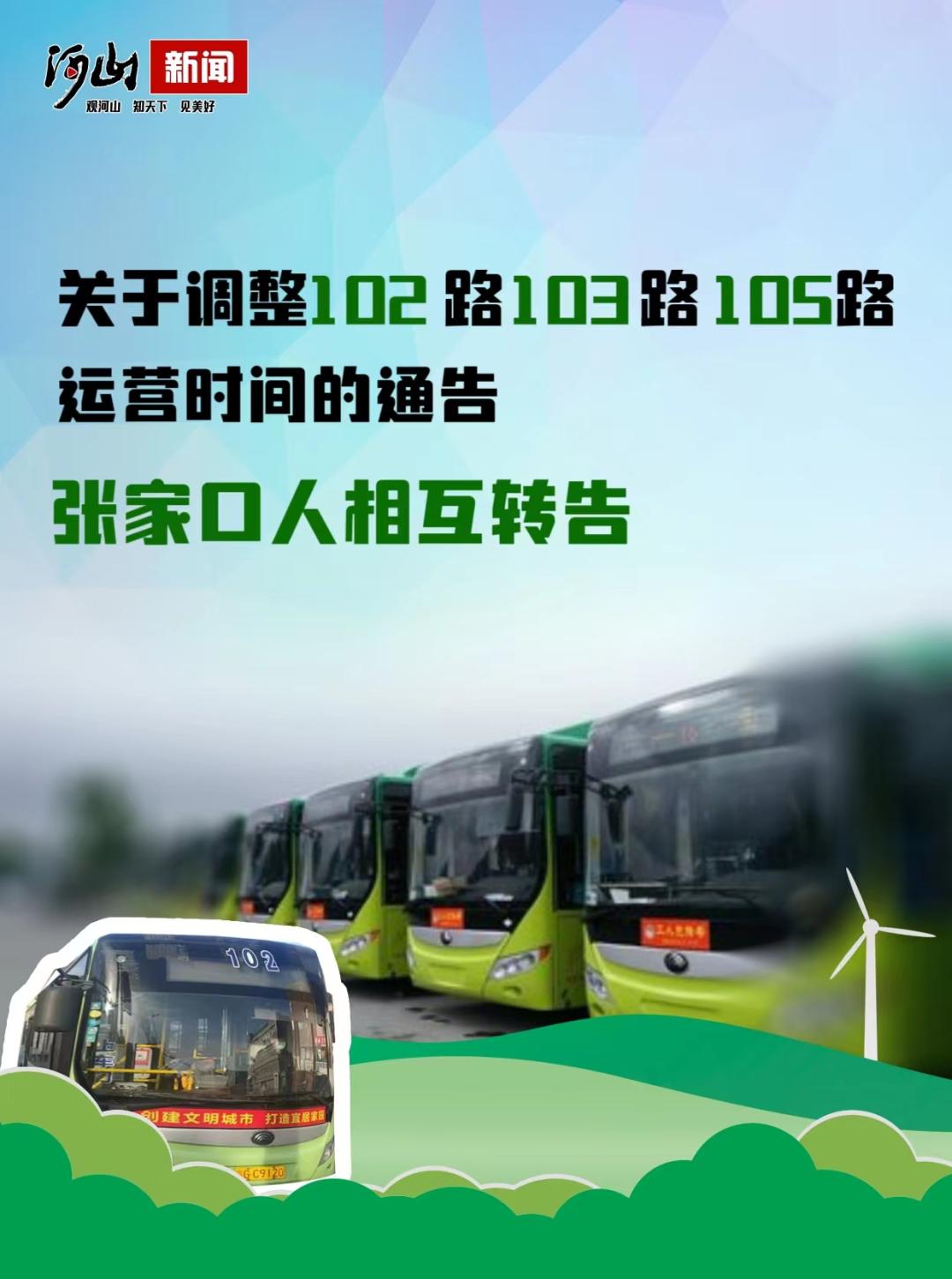 105路(张家口展览馆—宣化滨河路)自2023年10月1日起实行冬季运营时间:宣化首班车6:00发车,末班车17:30发车;张家口首班车7:00发车,末班车18:00发车。发车间隔30分钟至60分钟(宣化8:00-10:00、12:00-14:00,张家口9:30-11:30、13:30-15:30此时间段发车时间为60分钟,其它运营时间段发车间隔为30分钟)。请广大市民相互转告