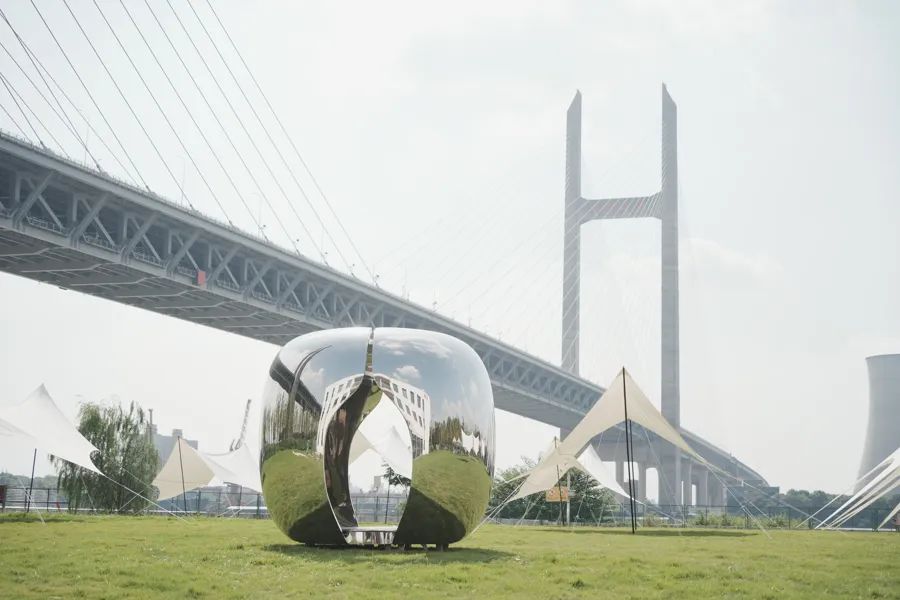 沿江艺术区,主要集中在浦江郊野公园滨江游客中心及沿江附近,主要展陈大型金属和玻璃钢雕塑,以及充气软雕塑。浦江对岸巨型工厂和江边保留着早期工业时代的历史遗址,而郊野公园这边营造大片林地,反映了当代城市发展重视生态的大趋势。新旧两个时代交错,赋予了这个展区独特的环境风貌和巨大的视觉冲击力。艺术家和策展团队选择特定的作品进行交流对话,显现出这些优秀雕塑作品的造型力量和思考能量。