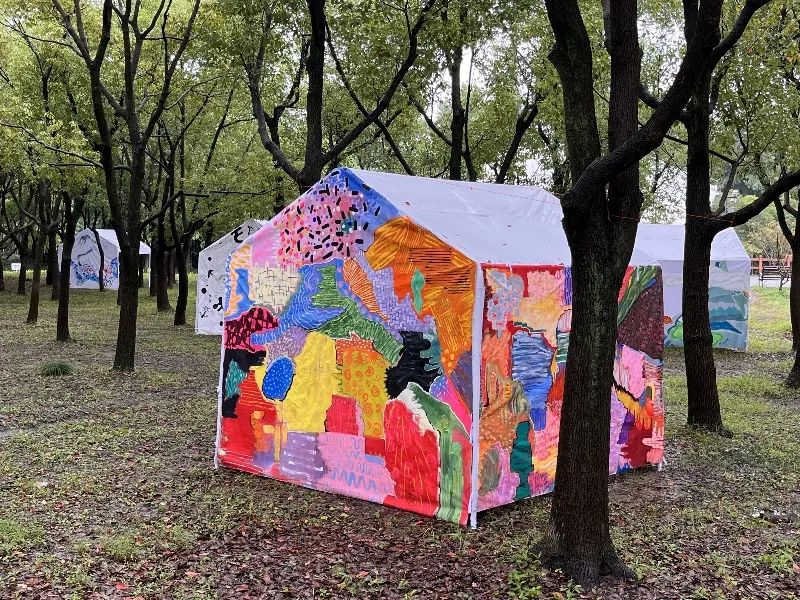 现场艺术帐篷区域作品:朱敬一《野山小狗的家》帐篷露营是近几年青年人和家庭的流行方式和生活乐趣。策划团队受此启发,推出用帐篷做艺术创作,是大地艺术的新形式,也成为浦江森林艺术季的特色之一。