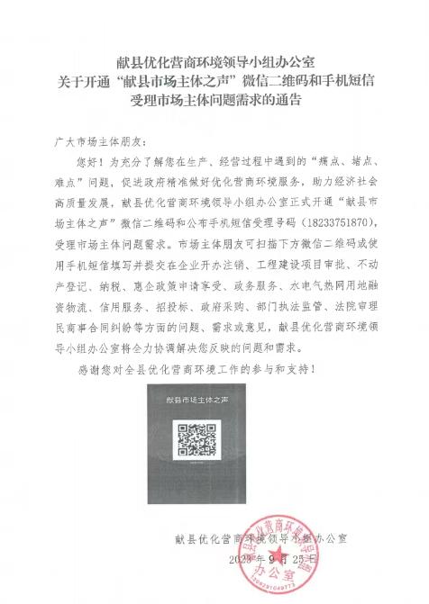 原标题:《献县优化营商环境领导小组办公室关于开通“献县市场主体之声”微信二维码和手机短信受理市场主体问题需求的通告》
