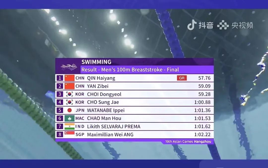 在刚刚结束的杭州亚运会游泳项目男子100米蛙泳决赛中,中国选手、来自上海的覃海洋以57秒76的成绩夺冠!并再次刷新该项目亚运会纪录。另一位中国选手闫子贝获得银牌。恭喜!