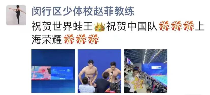 在赵菲朋友圈,有许许多多她带过的游泳健儿们的照片。今年日本福冈游泳世锦赛中,覃海洋一举夺得4枚金牌,她发了一条这样的朋友圈:“每一位体育人的终极目标,中国荣耀、上海荣耀、闵行荣耀!”恭喜覃海洋