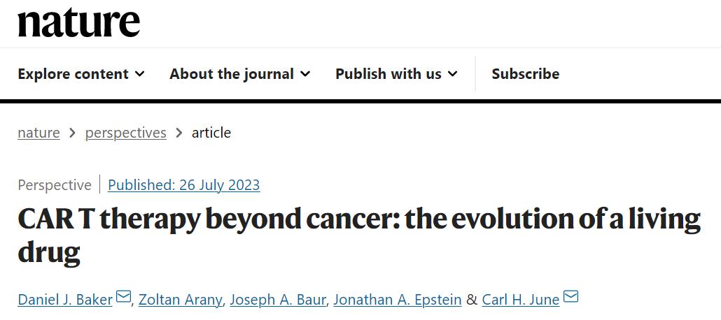 近日,Carl June 教授等在 Nature 发表了题为:CAR T therapy beyond cancer: the evolution of a living drug 的文章。